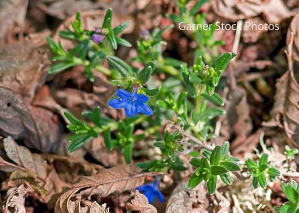 This macro stock photo is a bright blue lithodora diffusa in the variety of Grace Ward flower with it's evergreen leaves against some dried leaves in the background. Background is intentionally blurred for artistic effect. Common name of this ground cover is Indian Paint.